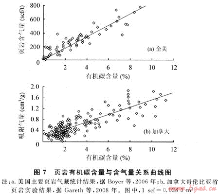 2) 有機(jī)碳含量愈高,氣藏富集程度愈高。商業(yè)性頁(yè)巖氣藏需要達(dá)到頁(yè)巖有機(jī)碳含量最低界限標(biāo)準(zhǔn)。斯倫貝謝公司對(duì)北美頁(yè)巖氣盆地的研究認(rèn)為,頁(yè)巖氣藏的有機(jī)碳含量最低標(biāo)準(zhǔn)原則上應(yīng)大于2.0%(表4)。因此,有機(jī)碳含量是頁(yè)巖氣藏評(píng)價(jià)中的一個(gè)重要指標(biāo),它既是頁(yè)巖生氣的物質(zhì)基礎(chǔ),決定頁(yè)巖的生烴強(qiáng)度,也是頁(yè)巖吸附氣的載體之一,決定頁(yè)巖的吸附氣大小,還是頁(yè)巖孔隙空間增加的重要因素之一,決定頁(yè)巖新增游離氣的能力。在相同的地質(zhì)條件及演化階段下,頁(yè)巖生烴強(qiáng)度、吸附氣量大小及新增游離氣能力與頁(yè)巖中有機(jī)碳含量呈明顯的線性正相關(guān)性。實(shí)驗(yàn)分析結(jié)果表明,頁(yè)巖含氣量(吸附氣及游離氣總量)隨頁(yè)巖有機(jī)碳含量的增加而增大(圖7-a)。對(duì)加拿大哥倫比亞省下白堊統(tǒng)BuckingHorse組202塊頁(yè)巖樣品的等溫吸附實(shí)驗(yàn)結(jié)果也同樣表明[7],頁(yè)巖有機(jī)碳含量與甲烷吸附量之間呈正相關(guān)分布(圖7-b)。此外,不同母質(zhì)類型、不同演化程度的頁(yè)巖,其等溫吸附曲線也存在明顯差別。頁(yè)巖有機(jī)質(zhì)類型越好,甲烷的吸附量越大[7]。但與此同時(shí),圖6、圖7中也存在一些異?,F(xiàn)象,說(shuō)明頁(yè)巖含氣量大小不僅僅受有機(jī)碳含量的影響,還可能受其他多種因素的影響,如黏土成分及含量、有機(jī)質(zhì)熱成熟度、頁(yè)巖含水量等。對(duì)此,尚需作進(jìn)一步的深入研究。