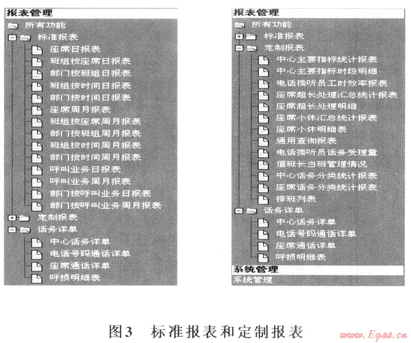 與服務(wù)熱線數(shù)字化管理的基本應(yīng)用工具比較,報表反映的內(nèi)容更全面更系統(tǒng)。尤其體現(xiàn)在熱線定制報表上。它把企業(yè)多年來在傳統(tǒng)數(shù)據(jù)統(tǒng)計匯總報表上積累的經(jīng)驗作了優(yōu)化組合和集中提煉,針對性和效果都很好。圖3截取了報表管理系統(tǒng)中有關(guān)報表分類的樹狀結(jié)構(gòu)分布。