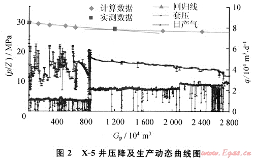 選取儲層物性好,可動儲量偏低的氣井重復(fù)改造,提高儲量動用程度。X-5井測井解釋儲層物性相對較好,有效厚度7m,滲透率0.33×10-3μm2,孔隙度5.8%,初期產(chǎn)氣1.0×104m3/d,只能間歇生產(chǎn),評價可動儲量僅1.13×108m3;2004年10月對該井進(jìn)行二次酸壓改造,產(chǎn)氣提高到2.0×104m3/d,評價該井可動儲量為2.34×108m3(圖2)。