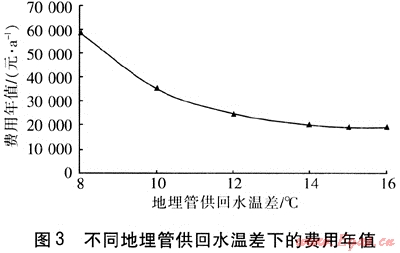 當?shù)責嶝摵杀壤秊?0%、地埋管外徑為25mm時,對地埋管供回水溫差進行優(yōu)化。不同地埋管供回水溫差下的費用年值見圖3。由圖3可知,費用年值在地埋管供回水溫差為15℃時最小。通過設(shè)計參數(shù)優(yōu)化設(shè)計可知,當?shù)責嶝摵杀壤秊?0%、地埋管供回水溫差為15℃、地埋管外徑為25mm時,地熱水溫室供熱系統(tǒng)的經(jīng)濟性最好。