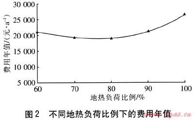 選取適中的地埋管回水溫度(30℃)、地埋管外徑(25mm),不同地熱負荷比例下的費用年值見圖2。由圖2可知,采用適中的地熱負荷比例,可獲得較低的費用年值。通過分析計算,不同供回水溫差、地埋管外徑下均存在類似的規(guī)律,因此可以確定地熱負荷比例為80%時,系統(tǒng)的經(jīng)濟性最好。