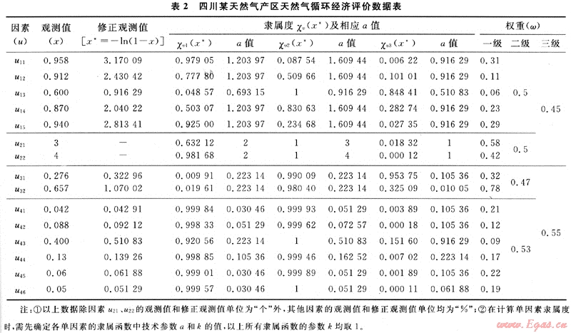 以四川某天然氣產(chǎn)區(qū)為例,通過到天然氣生產(chǎn)企業(yè)和相關(guān)政府部門調(diào)研討論,并依據(jù)各單因素指標數(shù)據(jù)以及各指標權(quán)重,計算各方面數(shù)據(jù),整理如表2。