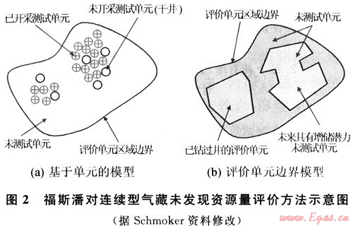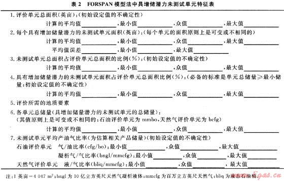 福斯潘模型(FORSPAN)法是USGS在1999年為連續(xù)型油氣藏資源評價(jià)而提出的一種評價(jià)方法。該方法以連續(xù)型油氣藏的每一個(gè)含油氣單位為對象進(jìn)行資源評價(jià),即假設(shè)每個(gè)單元都有油氣生產(chǎn)能力,但各單元間汗油氣性(包括經(jīng)濟(jì)性)可以相差很大,以概率形式對每個(gè)單元的資源潛力作出預(yù)測。以往也用體積法對連續(xù)型油氣藏資源潛力作過評價(jià)。在體積法中,原始資源量估算常用的參數(shù)主要是一些基本地質(zhì)參數(shù)(如面積、厚度、孔隙度等),這些參數(shù)有很大的不確定性,且各單元間關(guān)系密切、缺乏獨(dú)立性。因此,參數(shù)選取及標(biāo)準(zhǔn)確定較困難。福斯潘(FORSPAN)法建立在已有開發(fā)數(shù)據(jù)基礎(chǔ)上(圖2),估算結(jié)果為未開發(fā)原始資源量。因此,該方法適合于已開發(fā)單元的剩余資源潛力預(yù)測。已有的鉆井資料主要用于儲(chǔ)層參數(shù)(如厚度、含水飽和度、孔隙度、滲透率)的綜合模擬、權(quán)重系數(shù)的確定、最終儲(chǔ)量和采收率的估算。如果缺乏足夠的鉆井和生產(chǎn)數(shù)據(jù),評價(jià)可依賴各參數(shù)的類比取值。
