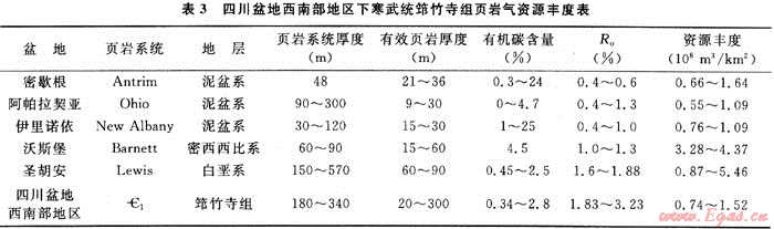 為確定四川盆地西南部地區(qū)下寒武統(tǒng)筇竹寺組頁巖氣資源豐度,筆者在威遠(yuǎn)氣田區(qū)實(shí)施了1口鉆井密閉取心,并對其進(jìn)行巖心吸附氣含量測試。威遠(yuǎn)氣田區(qū)下寒武統(tǒng)筇竹寺組頁巖有機(jī)碳含量為0.34%~2.8%,吸附氣含量0.43~0.86m3/t。需要說明的是根據(jù)區(qū)域地層研究,上述鉆井沒能得到該組中最好的黑色頁巖和碳質(zhì)頁巖段巖心,因此,測得的有機(jī)碳與吸附氣含量僅具有不完全代表性,這一問題有待繼續(xù)研究。將筇竹寺組頁巖特征與美國五大頁巖氣含氣盆地對比(見表3),確定出四川盆地西南部地區(qū)下寒武統(tǒng)筇竹寺組頁巖氣資源豐度為0.74×108~1.52×108m3/km2