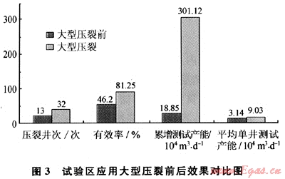 該氣藏通過大型壓裂,獲得了顯著的增產(chǎn)效果及較高的開采效益,圖3是該氣藏應(yīng)用大型壓裂前后效果對比圖。