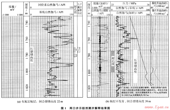 在壓裂施工中加入示蹤劑,通過壓后井溫度測井和示蹤劑確定縫口裂縫高度。通過對裂縫高度測量,可以對泥巖隔層的遮擋性和儲層裂縫高度延伸規(guī)律進行研究,進一步優(yōu)化壓裂設(shè)計,與壓裂數(shù)據(jù)共同分析,確定裂縫有效幾何形態(tài)(圖1)。