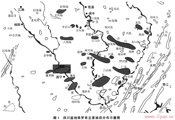四川盆地雖以產(chǎn)氣為主,但至今仍在盆地內(nèi)發(fā)現(xiàn)了柘壩場、金華鎮(zhèn)、秋林、中臺山、石龍場、八角場、公山廟、充西-蓮池、桂花、一立場、稅家槽、鮮渡河等油田(圖1)。在四川盆地中部(川中)侏羅系中自下而上發(fā)現(xiàn)了珍珠沖段、東岳廟段、大安寨段、涼高山組、沙溪廟組5個含油層段,其中大安寨段、涼高山組和沙溪廟組為主力產(chǎn)油層。川西南部和中部在侏羅系地層中發(fā)現(xiàn)了新場、洛帶、平落壩、大興西等氣田,川西北部侏羅系露頭發(fā)現(xiàn)了油砂巖[1]。1950~1960年間在江油海棠鋪構(gòu)造所鉆井至今井口仍有少量原油產(chǎn)出。川東地區(qū)在侏羅系鉆井中也頻見油氣顯示,新5井日產(chǎn)原油36t[2]。川東北渡口河、五寶場地區(qū)于侏羅系上沙溪廟組亦發(fā)現(xiàn)氣藏并投入開發(fā)。為此,研究了四川盆地侏羅系的油氣成藏條件。