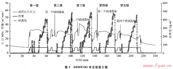 2009年對(duì)DX1424井采用小階梯類似線形加砂壓裂,控制前置液比例50%以上,排量確定為4m3/min左右,加砂規(guī)模介于2.0~3.0m3/min,壓裂后日產(chǎn)氣29.0×104m3。
