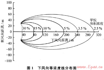 在LNG場站選址時(shí),需要遠(yuǎn)離居民區(qū),以保證人民生命財(cái)產(chǎn)安全,因此,場站與居民區(qū)之間的距離是重要的考慮因素。LNG在泄漏過程中,自泄漏源開始,氣體濃度逐漸被稀釋,當(dāng)其體積濃度在5%~15%范圍內(nèi)(即甲烷的爆炸極限內(nèi)),存在發(fā)生火災(zāi)或者爆炸的可能性。為了確保間隔距離劃定的可靠性,相關(guān)標(biāo)準(zhǔn)(如NFPA59A),規(guī)定其下風(fēng)向體積濃度為2.5%處的距離為安全距離[4]。以Burro系列5號實(shí)驗(yàn)為例(以下簡稱B5),其下風(fēng)向上體積濃度的等濃度線見圖1,可以看出下風(fēng)向體積濃度5%和2.5%的最大距離差約為110m。以下用所建的計(jì)算模型,對氣體擴(kuò)散過程和安全距離的影響因素進(jìn)行分析。