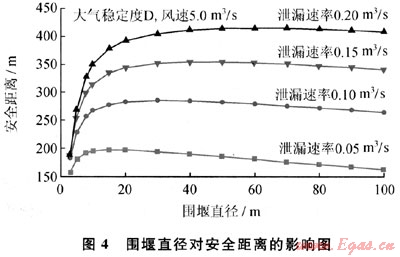 LNG儲罐周圍通常要設(shè)計(jì)圍堰,以防止儲罐發(fā)生泄漏時(shí),液體四處流淌蔓延,若發(fā)生火災(zāi),還可以防止火焰蔓延到周邊地區(qū)[4]。LNG泄漏到圍堰內(nèi),會迅速蒸發(fā)氣化,形成以圍堰為二次源的蒸氣云團(tuán)擴(kuò)散。圖4給出下風(fēng)向安全距離隨著圍堰直徑和泄漏速率的變化。當(dāng)圍堰尺寸較小時(shí),以圍堰為二次源云團(tuán)的范圍也較小,有限的蒸發(fā)氣受大氣湍流影響,其濃度較快稀釋,安全距離較??;當(dāng)圍堰尺寸過于增大時(shí),二次源云團(tuán)的天然氣濃度較低,其下風(fēng)向擴(kuò)散距離不再增加,反而略有減少。