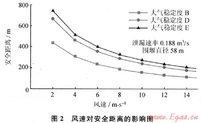 所建立的LNG泄漏氣體擴(kuò)散模型計(jì)算方法,經(jīng)過實(shí)驗(yàn)驗(yàn)證,其平均偏差為24.28%,并較準(zhǔn)確地體現(xiàn)了重氣擴(kuò)散過程中云團(tuán)內(nèi)部特性的變化規(guī)律。對于穩(wěn)態(tài)LNG氣體擴(kuò)散,當(dāng)風(fēng)速大于2m/s時(shí),隨著風(fēng)速的增加,安全距離是逐漸減小的;對于較小風(fēng)速(小于2m/s)時(shí),該穩(wěn)態(tài)模型將不再適用。泄漏速率增大使安全距離幾乎成比例增大,是影響安全距離最重要因素之一。對于給定的LNG泄漏率,圍堰尺寸變化對安全距離的影響會呈現(xiàn)出一個(gè)弱峰,之后安全距離會隨圍堰尺寸的增加而略有減小。