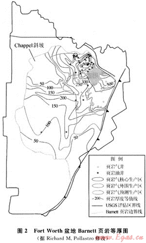 生產(chǎn)實踐表明:頁巖形成氣藏的厚度下限為15m;TOC越高含氣量越高,且當(dāng)丁0C≥2%時,Barnett頁巖氣藏才具有商業(yè)價值。蓋層的作用不明顯,實際上目前的高產(chǎn)區(qū)在Marble Falls和Viola這兩套致密石灰?guī)r都缺失的區(qū)域。