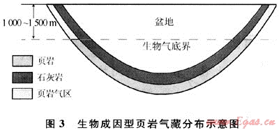 目前發(fā)現(xiàn)的生物成因型頁巖氣藏分兩類:①早成型,氣藏的平面形態(tài)為毯狀,從頁巖沉積形成初期就開始生氣,頁巖氣與伴生地層水的絕對年齡較大,可達66Ma,如美國Williston盆地上白堊統(tǒng)Carlile頁巖氣藏;②晚成型,氣藏的平面形態(tài)為環(huán)狀(圖3),頁巖沉積形成與開始生氣間隔時間很長,主要表現(xiàn)為后期構(gòu)造抬升埋藏變淺后開始生氣,頁巖氣與伴生地層水的絕對年齡接近現(xiàn)今,如美國Michigan盆地的Antrim頁巖氣藏[7]。生物成因型頁巖氣藏以Antrim頁巖氣藏最有代表性。
