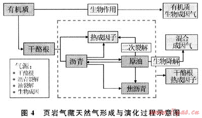 研究表明,熱成因氣的形成有干酪根成氣、原油裂解成氣和瀝青裂解成氣3種途徑:①干酪根成氣是由沉積有機質(zhì)直接熱解形成天然氣。②原油裂解成氣是有機質(zhì)在液態(tài)烴演化階段形成的、滯留在烴源巖中的液態(tài)烴,經(jīng)深埋藏后的高溫、高壓作用,進(jìn)一步裂解成氣。③瀝青裂解成氣的物質(zhì)基礎(chǔ)來源于兩個方面:一是源巖中干酪根在各演化階段生烴過程中形成的,另一方面是由原油裂解成氣或遭破壞形成的。原油及瀝青二次裂解生成的天然氣量大小主要取決于烴源巖中有機質(zhì)豐度、類型以及液態(tài)烴殘留量。由烴源巖有機質(zhì)熱演化直接成氣及原油裂解成氣是頁巖氣藏中天然氣的主要來源。