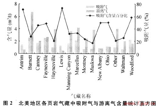 圖2為美國頁巖氣藏中的氣體組成統(tǒng)計結(jié)果,表明不同地質(zhì)條件下形成的頁巖氣藏其吸附氣與游離氣的含量存在較大差別。頁巖氣藏中吸附氣含量比例較高,變化范圍較大。頁巖含氣量最高的(如Barnett頁巖氣藏)可達(dá)10m3/t,最低(如New Albany頁巖氣藏)僅有1.1m3/t,含氣量平均為3.81m3/t。其中,吸附氣含量最低為16%,最高達(dá)80%。吸附氣含量的變化主要受巖石組成、有機質(zhì)含量、地層壓力、裂縫發(fā)育程度等因素影響,詳見后述。