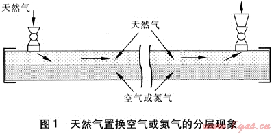 在置換過程中,將天然氣緩慢輸入到新建管道內,由于天然氣的密度小,相對密度一般為0.6左右,天然氣就會在管道的上部流動,而位于管道下部的空氣或氮氣就會滯留在管道內。當檢測人員從出口取樣檢測時,儀器會顯示體積分數(shù)為100%的天然氣,如果此時停止置換,滯留在管道內的空氣將與天然氣混合,非??赡苄纬杀ㄐ曰旌蠚怏w,在用戶使用時發(fā)生危險。這種情況會給安全運行帶來極大的隱患。