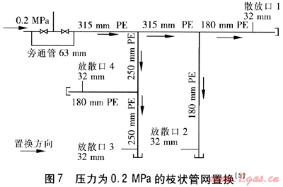 同時置換就是一個進氣口通入天然氣,所有支管上的放散口同時放散。這種方法要求較高,需要進行計算,必須保證所有支管的天然氣流速大于最小置換流速。而且此方法需要操作人員較多,控制復雜。此方法優(yōu)點是置換時間短,效率高,對周邊影響小。當所有支管的放散口取樣檢測的氧氣體積分數(shù)低于2%時,置換完成。注意,在置換過程中至少保持一個放散口始終打開,理論上要求最遠端的放散口在置換完成前一直打開。