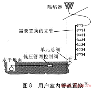 用戶管道系統(tǒng)置換中,需要完成從用戶支閥到建筑物外低壓管網控制閥的天然氣置換。一般這類置換管道長度較短,管道總容積較小,可以采用管道最遠端置換的方法[6、7]。用戶室內管道置換見圖8[5]。具體操作是將連接隔焰器的軟管連接于頂層用戶支閥,打開單元總閥進行置換,置換過程中持續(xù)取樣監(jiān)測,直至連續(xù)2次測得天然氣體積分數(shù)達到95%以上或取樣中的氧氣體積分數(shù)在2%以下即為合格[1](在英國的置換要求中,此數(shù)據(jù)為連續(xù)2次測得天然氣體積分數(shù)達到90%以上或取樣中的氧氣體積分數(shù)在4%以下即為合格[2]),停止放散,置換完成。