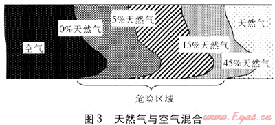 天然氣直接置換方法的特點是比較簡便也比較經濟,但是具有一定的危險性。因為在置換過程中,管道里必然要產生天然氣與空氣的混合氣體,天然氣的前部氣體與空氣混合后,有一部分的混合氣在爆炸極限內,很容易在某外界因素的誘發(fā)下(如管道內焊渣、金屬顆粒滾動等)產生爆炸,因此操作有嚴格的控制條件和要求,必須嚴格按規(guī)程實施,否則非??赡馨l(fā)生事故。對于天然氣來講,它的爆炸極限為5%~15%,再考慮到其混合的不均勻性,天然氣體積分數(shù)在45%以下均應視為危險區(qū)(見圖3,圖中數(shù)據(jù)均為體積分數(shù)),遇火源就要發(fā)生爆炸。為此必須嚴格控制,采取各種安全措施,確保無火源。