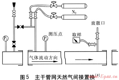 間接置換方法具體操作過程是先將惰性氣體注入管道,在管道末端放散,使用惰性氣體置換出空氣,直至放散管取樣口惰性氣體的體積分數(shù)達到預定的置換標準為止。在實際操作過程中一般用氧氣體積分數(shù)來衡量,如果連續(xù)2次取樣中的氧氣體積分數(shù)達到2%以下即為合格[1](在英國的置換要求中,此數(shù)據(jù)為連續(xù)2次測得取樣中的氧氣體積分數(shù)達到4%以下即為合格[2]),停止通入惰性氣體。然后再將天然氣通入管道,同樣操作,在檢測管的取樣口取樣,用高精度燃氣檢測儀進行實時的監(jiān)測分析,如果連續(xù)2次測得天然氣體積分數(shù)達到95%以上即為合格[1](在英國的置換要求中,此數(shù)據(jù)為連續(xù)2次測得天然氣體積分數(shù)達到90%以上即為合格[2]),置換完成。此法操作復雜、繁瑣,進行2次換氣,不僅耗用大量惰性氣體還耗用大量的燃氣,費用較高,并且換氣時間長,工作量大。但是,它可以確保進入管道內的燃氣不會與管道內空氣接觸,不會形成具有爆炸性的混合氣體。因此,此法可靠性好,安全系數(shù)高,成功率也高。主干管網天然氣間接置換見圖5[4]。