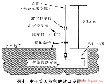 由于天然氣管道是封閉的,管道建成后經歷了吹掃、強度試驗、嚴密性試驗等工序,管道內沒有活動部件,不可能因運動、撞擊產生火花。可能出現(xiàn)的火源有以下兩種:一是高速氣流會因摩擦產生靜電,所以置換時要對管道系統(tǒng)進行接地(見圖4[4]),即便有靜電負荷產生,也會立即通過接地裝置導入大地,不會有電荷積聚導致高電位而產生放電火花。二是高速氣流吹動管道中可能殘留下來的石塊、鐵屑、焊條頭等固體物質,與管道內壁碰撞產生火花。引起此類事故的根本原因是高速氣流,解決的關鍵是確保氣流的低速,這樣即便有石塊等雜物,也不會被吹動,也就不可能產生火花。此外,為了避免將雜物帶進管道,應事先在進氣管道上設置過濾器。根據(jù)英國相關資料及國內應用經驗,我們將置換管道用天然氣的氣流速度控制在最小置換流速以上,一般最大流速控制在3m/s以下。在置換過程中采用流速計或U型壓力表觀察管道升壓速度的辦法來測量其充氣流速,用閥門的開度來控制流速(混氣過程中控制閥前的壓力要保持穩(wěn)定)。