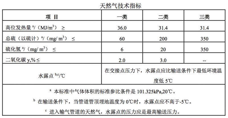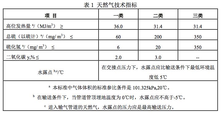 GB50028《城鎮(zhèn)燃氣設計規(guī)范》2006中對天然氣的質量進行了規(guī)定:天然氣發(fā)熱量、總硫和硫化氫含量、水露點指標應符合現(xiàn)行國家標準《天然氣》GB17820的一類氣或者二類氣的規(guī)定。