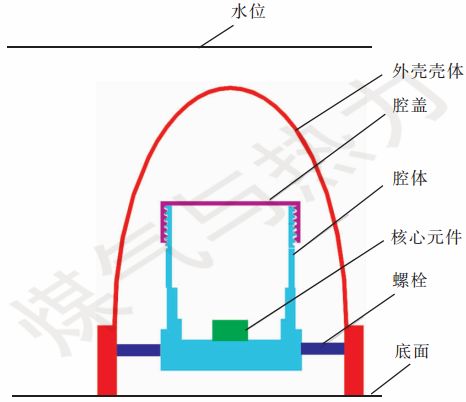 如圖2所示,防水透氣殼的外殼殼體采用橢球狀設(shè)計,腔體高度大于外殼殼體高度的1/2。當(dāng)水位沒過裝置底面達10 m時,防水透氣殼內(nèi)部氣體體積大約被壓縮到原體積的1/2,裝置的外殼殼體采用半橢球形設(shè)計,因此,此時外殼殼體內(nèi)水面在外殼殼體高度的1/2位置以下。本裝置腔體的設(shè)計高度大于外殼殼體高度的1/2,因此,防水透氣殼內(nèi)的水面位置在腔蓋以下,可以防止液態(tài)水進入腔體內(nèi)??梢姡词乖谒粵]過裝置底面達10 m的惡劣條件下,該裝置仍能夠?qū)η惑w內(nèi)的核心元件起到很好的保護作用。