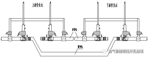 本次改造施工采用四封四堵不停輸封堵工藝,該種工藝優(yōu)點(diǎn)在于:所有工序均在不影響管線(xiàn)內(nèi)介質(zhì)正常輸送的狀態(tài)下進(jìn)行且減少了長(zhǎng)距離鋪設(shè)旁通管線(xiàn)的工作量,縮短了施工周期,使工作進(jìn)行的井然有序,安全可靠。