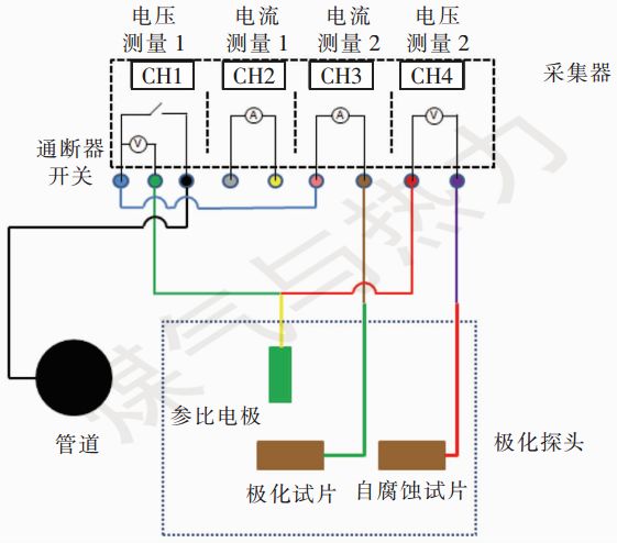 從圖1可以看出,極化試片通過棕色端子、粉色端子、藍色端子、通斷器開關以及黑色端子之間的電纜與管道連接(其中電流測量模塊2內部的高精度電流表內阻可忽略不計)。測量管道通電電位時,電壓測量模塊1內部ms級電路控制模塊的通斷器開關合上,此時極化試片通過棕色端子、粉色端子、黑色端子之間的電纜與管道電連接,這就意味著極化試片與管道處于等電位狀態(tài),此時通過測量極化試片電纜與極化探頭的參比電極電纜之間電位差即可得到管道通電電位。測量極化電位時,通過采集器內部ms級電路控制模塊控制通斷器的開關處于斷開狀態(tài),并精準控制極化試片與管道的斷開時間,此時極化試片由于通斷器開關斷開而與管道之間處于斷開的狀態(tài),利用采集器電壓測試模塊1測量斷電情況下極化試片電纜與極化探頭的參比電極電纜之間的電位差,即可獲得極化電位。測量自腐蝕電位時,通過采集器內部電壓測量模塊2測量極化探頭的自腐蝕試片電纜與極化探頭的參比電極電纜之間的電位差。測量直流電流密度(自腐蝕試片的面積數(shù)據(jù)已存儲在采集器中)時,任意選用采集器內部電流測量模塊1或者模塊2,圖1中是利用電流測量模塊2測量極化探頭內極化試片與管道之間的直流電流密度。電流測量模塊2正極接粉色端子,粉色端子通過藍色端子、通斷器開關以及黑色端子之間的電纜與管道相連,電流測量模塊2負極接極化試片。這就相當于電流測量模塊2一端接管道,一端接極化試片,通過電流測量模塊2即可測量極化試片與管道之間的直流電流密度,并且利用電流測量模塊同時可測量出極化試片與管道之間的交流電流密度。