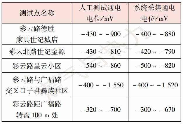 在近地鐵處選取5個測點,人工測試選用便攜式參比電極測量通電電位。人工測試數(shù)據(jù)與系統(tǒng)測試數(shù)據(jù)的對比見表1。