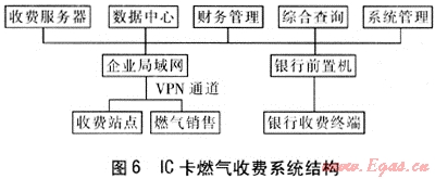 大慶燃?xì)夤綢C卡燃?xì)馐召M(fèi)系統(tǒng)是依托計(jì)算機(jī)網(wǎng)絡(luò)建立的燃?xì)怃N售信息管理系統(tǒng),它融合了當(dāng)今成熟的數(shù)據(jù)庫技術(shù)及網(wǎng)絡(luò)技術(shù),實(shí)現(xiàn)了燃?xì)怃N售的實(shí)時(shí)開戶、售氣、售氣信息管理等功能。IC卡燃?xì)馐召M(fèi)系統(tǒng)結(jié)構(gòu)見圖6,IC卡燃?xì)馐召M(fèi)系統(tǒng)包括收費(fèi)服務(wù)器、數(shù)據(jù)中心、財(cái)務(wù)管理、綜合查詢、系統(tǒng)管理,由收費(fèi)服務(wù)器和銀行前置機(jī)實(shí)現(xiàn)上述功能。