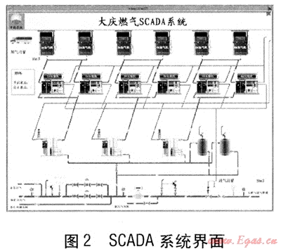 ② 數(shù)據(jù)存儲、分析和處理。SCADA系統(tǒng)界面見圖2,對高于上限或低于下限的實(shí)時(shí)數(shù)據(jù)做出超高、超低報(bào)警;根據(jù)需要提供生產(chǎn)數(shù)據(jù)報(bào)表,還提供趨勢圖,用以輔助分析用氣規(guī)律;系統(tǒng)提供了7種不同功能的使用權(quán)限,使操作員和維護(hù)人員可以根據(jù)使用需求更方便地進(jìn)行工作;系統(tǒng)具有事件記錄功能,無論是實(shí)時(shí)數(shù)據(jù)報(bào)警還是通信故障,一切信息都作為事件被記錄在系統(tǒng)中,以供日后查看。