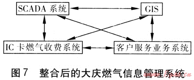 對于大慶燃?xì)釹CADA、GIS、客戶服務(wù)業(yè)務(wù)系統(tǒng)、IC卡燃?xì)馐召M(fèi)系統(tǒng),在建設(shè)初期即考慮到各系統(tǒng)對接、數(shù)據(jù)共享等系統(tǒng)間的整合問題。整合后的大慶燃?xì)庑畔⒐芾硐到y(tǒng)見圖7。
