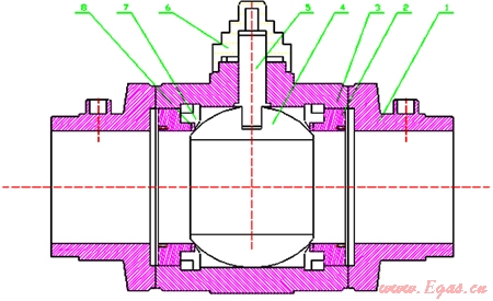 PE球閥是由塑料配件組成的全封閉式結(jié)構(gòu),由接管座1,閥座2,閥殼體3,閥球4,閥桿5,扳手6,擋圈7,密封圈8組成。其中接管座1,閥座2,閥殼體3采用與管體相同的PE材料制成,閥球4,閥桿5,扳手6,擋圈7用比主體材料硬度、強(qiáng)度更高的其他塑料制成。通過(guò)閥座2,擋圈7來(lái)固定密封圈8,并構(gòu)成閥座組合體,分布在閥球8的兩側(cè),閥桿環(huán)形凹槽上的密封圈和扳手內(nèi)腔上的密封圈保證了PE球閥在閥桿5、扳手6處的密封性,而閥殼體3、閥座2與接管座1又通過(guò)熱熔方式組合成一整體,保證了連接處的嚴(yán)密性,因此PE球閥在通常情況下不會(huì)產(chǎn)生外泄漏現(xiàn)象。