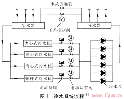 為了保證在部分負(fù)荷時(shí)冷水機(jī)組的高效運(yùn)行,選用3臺(tái)離心式冷水機(jī)與1臺(tái)螺桿式冷水機(jī),在過(guò)渡季節(jié)或負(fù)荷較小時(shí),只開(kāi)啟螺桿式冷水機(jī)。冷水機(jī)進(jìn)出水溫度為13、7℃,冷水機(jī)與附屬設(shè)備見(jiàn)表1[8]??照{(diào)水系統(tǒng)為一次泵、末端變流量、機(jī)組側(cè)定流量系統(tǒng),采用二管制,豎向不分區(qū),末端空調(diào)裝置采用風(fēng)機(jī)盤管,冷水系統(tǒng)流程見(jiàn)圖1㈨。
