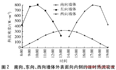 墻體內(nèi)外側(cè)表面?zhèn)鳠嵯禂?shù)分別取8.7、23.3W/(m2·K),根據(jù)文獻(xiàn)[7]提供的圍護結(jié)構(gòu)基本耗熱量及圍護結(jié)構(gòu)傳熱系數(shù)計算式,計算得出圍護結(jié)構(gòu)傳熱系數(shù)為0.3W/(m2·K)。若室內(nèi)溫度保持18℃,根據(jù)傳統(tǒng)墻體供暖熱負(fù)荷計算方法,得到單位面積基本耗熱量為17.7W/m2。由圖2可知,除了南向墻體8:00、19:00兩個時刻熱流密度小于17.7W/m2外,其余時刻在太陽輻射條件下3個朝向墻體外表面向內(nèi)側(cè)的熱流密度均遠(yuǎn)高于單位面積基本耗熱量。因此,在實際設(shè)計及運行中,應(yīng)根據(jù)建筑墻體朝向及太陽輻射情況,采用合理的供暖系統(tǒng)運行方案,這樣既能滿足供熱要求,又能合理地使用能源,降低運行成本。