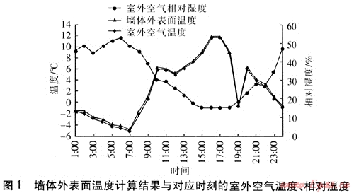 為了對太陽輻射條件下墻體外表面向內(nèi)側(cè)的傳熱量進行分析,選定墻體結(jié)構(gòu)及材料熱工性能參數(shù)見表1,熱工性能參數(shù)滿足DB 63/643—2007《青海省居住建筑節(jié)能設(shè)計標(biāo)準(zhǔn)》。墻體外表面為淺色涂料,建筑物四周為綠色草坪。墻體外表面溫度采用有限差分法進行計算,并采用ANSYS計算軟件對結(jié)果進行校核。墻體外表面溫度計算結(jié)果與對應(yīng)時刻的室外空氣溫度、相對濕度見圖1。