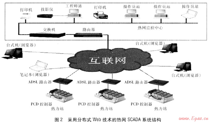 基于分布式Web技術(shù)的熱網(wǎng)SCADA系統(tǒng)的關(guān)鍵是建立Internet的連接從而訪問PCD控制器,該工程每座熱力站都通過ADSL路由器將PCD控制器連接到Internet。
