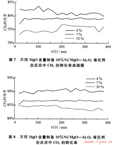 圖7、圖8為不同含量MgO-Al203載體制成10%Ni/MgO-Al203催化劑在反應(yīng)中CH4和CO2的轉(zhuǎn)化率。從圖7、8中可以看出,在反應(yīng)過程中10%Ni/4%MgO-Al203催化劑的催化活性最高,CH4和CO2轉(zhuǎn)化率分別為82%和90%左右。隨著反應(yīng)的進(jìn)行,10%Ni/4%MgO-Al203催化劑的催化活性略有浮動,但其轉(zhuǎn)化率仍然較高,在整個(gè)反應(yīng)過程中催化劑的催化活性變化都不是很大,表明其穩(wěn)定性較好。