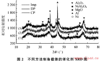 圖2為不同方法制備4%MgO-Al203載體制成催化劑的XRD譜圖。通過與標(biāo)準(zhǔn)譜圖進(jìn)行對比可以得知這3種催化劑中都存在Ni、Al、MgO、Al203、NiAl2O4相,其中,當(dāng)2θ為36°處存在NiAl2O4尖晶石的衍射峰,共沉淀法制備的載體催化劑的NiAl2O4衍射峰最弱,而其他兩種方法NiAl2O4的衍射峰逐漸增強(qiáng),說明Ni與Al2O3的相互作用較強(qiáng),使活性中心Ni的含量較少,進(jìn)而影響其催化劑的催化活性。