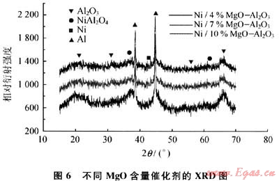 圖6為不同MgO含量的載體催化劑的XRD譜圖,通過與標(biāo)準(zhǔn)譜圖對比可以看出,在2口為36°和62°兩處出現(xiàn)NiAl2O4尖晶石的衍射峰,4%MgO-Al203載體曲線中NiAl2O4的衍射峰很弱,但隨著MgO加入量的增加,NiAl2O4的衍射峰逐漸增強(qiáng),說明Ni與Al2O3的相互作用增強(qiáng),活性中心Ni逐漸減少,而且4%MgO-Al203載體的曲線比較散漫,表明粒徑分布較為均勻,使得催化活性較好。