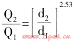 舊有的管網(wǎng)系統(tǒng)中管徑較小的管道有可能是制約管網(wǎng)通過能力的瓶頸。通過管網(wǎng)計算,北京市中壓管網(wǎng)主干線個別管段由于管徑較小,嚴(yán)重阻礙了管網(wǎng)輸送,應(yīng)將此管段進行擴徑,如香山南路管線,管徑為DN400。全長4000m。其中有一段DN100,導(dǎo)致附近壓力偏低,若將此段管線改為DN400,附近壓力由0.04MPa,升到0.06MPa。圖5所示為擴大管徑對管輸能力提高倍數(shù)的影響,計算式: