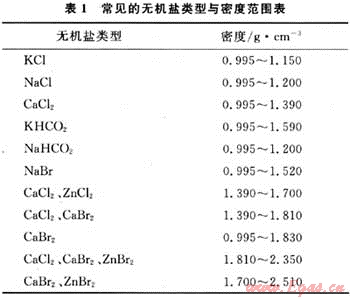 完井液、壓井液體系所采用的加重材料主要是可溶性無機鹽類,主要用來增加或調(diào)節(jié)完井液、壓井液的密度,常見的無機鹽及其密度范圍,見表1。對高含H2S的油氣井,進行完井修井作業(yè)所采用的體系中不宜采用ZnCl2、ZnBr2作為加重材料,除非采用新型除硫劑技術(shù),以免因產(chǎn)生ZnS沉淀破壞液體性能的穩(wěn)定性,甚至誘發(fā)井下安全事故發(fā)生和損害地層。