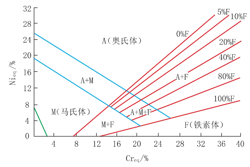 根據(jù)舍夫勒?qǐng)D按焊縫金屬中的Cr 當(dāng)量和Ni當(dāng)量值估算出鐵素體的含量,若焊縫金屬組織處于A+F (奧氏體+鐵素體) 區(qū)域,則焊縫組織含有一定量的鐵素體,具有一定的抗裂性能。 Gr-Ni 鋼舍夫勒?qǐng)D如圖1 所示。