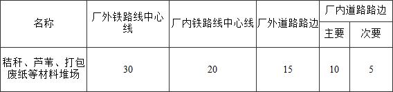 4.5.3  露天、半露天秸稈、蘆葦、打包廢紙等材料堆場與鐵路、道路的防火間距不應小于表4.5.3的規(guī)定,其他可燃材料堆場與鐵路、道路的防火間距可根據(jù)材料的火災危險性按類比原則確定。