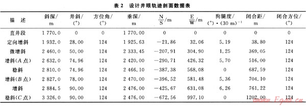 直井段采用自浮式單點(diǎn)測(cè)斜儀和電子多點(diǎn)測(cè)斜儀監(jiān)測(cè);造斜段和水平段用無線隨鉆測(cè)斜儀全程跟蹤監(jiān)測(cè),用電子多點(diǎn)測(cè)斜儀復(fù)測(cè)。