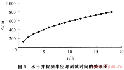 給定水平井段長(zhǎng)度為500m,氣層厚度為40m,水平滲透率為0.005μm2,各向異性系數(shù)為2,氣體黏度為0.04mPa·s,孔隙度為10%,綜合壓縮系數(shù)為0.0005MPa-1,測(cè)試時(shí)間1~18h。由式(8)得出探測(cè)半徑與測(cè)試時(shí)間的關(guān)系如圖3所示。從圖3可以看出,探測(cè)半徑隨時(shí)間延長(zhǎng)上升幅度減小,呈現(xiàn)非線性特征。