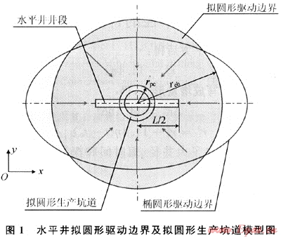 筆者是基于現(xiàn)有油氣井探測(cè)半徑公式主要應(yīng)用于直井并存在諸方面的缺陷而提出的。將水平井滲流問(wèn)題轉(zhuǎn)為擬圓形坑道的虛擬直井滲流問(wèn)題,從而得出油氣藏水平井探測(cè)半徑計(jì)算公式。