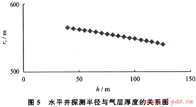 給定氣層厚度40~125m,其他參數(shù)同前,由式(8)得出探測(cè)半徑與氣層厚度的關(guān)系(圖5)。可以看出:氣層厚度增大,探測(cè)半徑減小,但減小的幅度很小。此即說(shuō)明滲流截面積越大,壓力波向地層推進(jìn)越慢。
