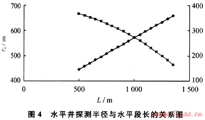 給定水平井段長(zhǎng)500~1350m,測(cè)試時(shí)間10h,其他參數(shù)同前,由式(8)得出探測(cè)半徑與水平段長(zhǎng)度的關(guān)系(圖4)??梢钥闯觯簲M圓形坑道外緣半徑隨水平段長(zhǎng)的增產(chǎn)而變大,而探測(cè)半徑是降低的。